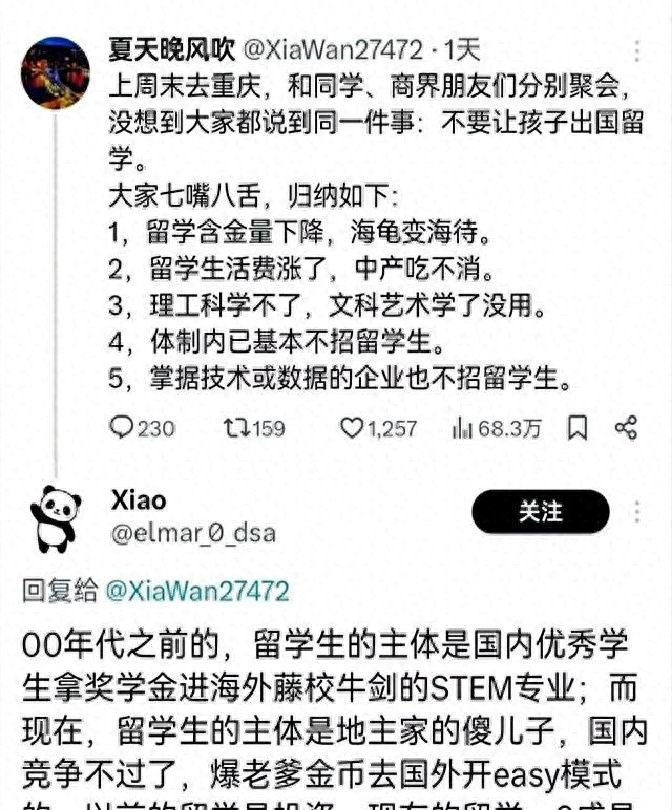 有的家长早就被留学这事“教育”过一回。兰姐一直拿表妹做例子说事。为了孩子出国读书,她表妹不光卖了新区的房子,把户型也换成小的,还把剩下的钱全投进学费。结果闺女学成回国,却只能在上海浦东做外包实习,税前八千,转眼还想考香港的证书。兰姐家里人叹口气直说不值,老人一看房贷账单就扎心,女儿再嚷嚷去考证,“先赚钱再说”,一句话也阻拦不住。